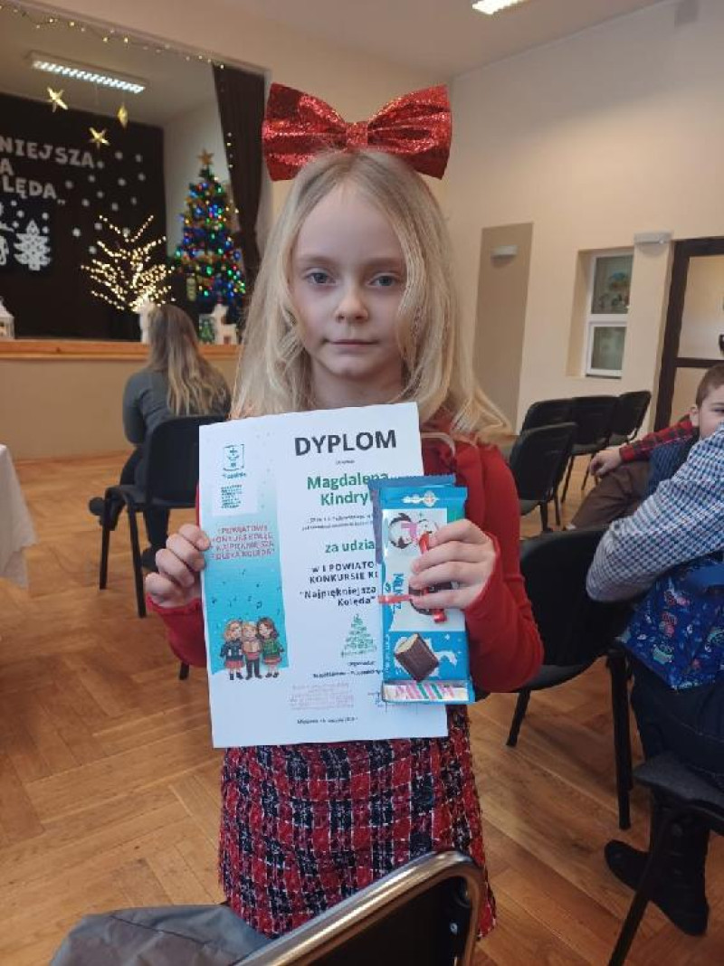 14 stycznia 2026r. Madzia Kindryk z klasy I reprezentowała naszą szkołę w I Powiatowym Konkursie Kolęd „Najpiękniejsza Polska Kolęda” w Młoszowej.