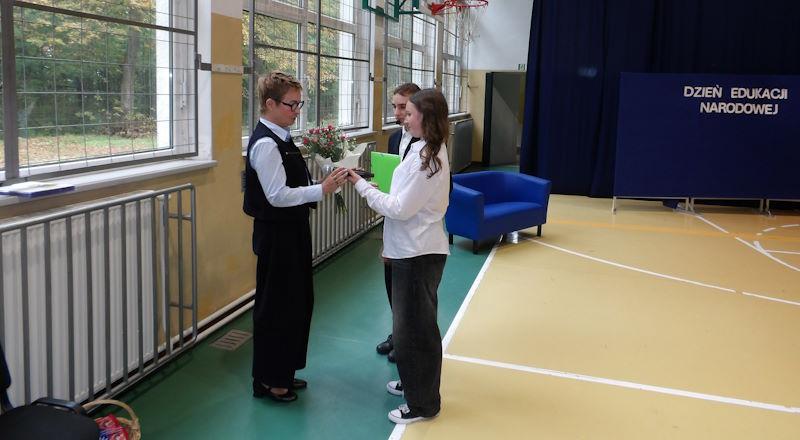 W imieniu całej społeczności uczniowskiej, Przewodniczący Samorządu Uczniowskiego, Sebastian, złożył na ręce dyrektora szkoły, pani Sylwii, serdeczne podziękowania dla nauczycieli oraz obsługi za ich codzienny trud i zaangażowanie.