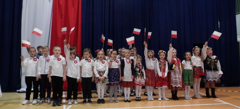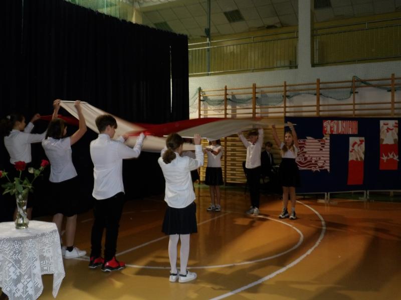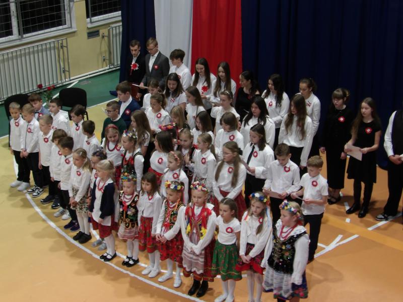 Wspólne śpiewanie pieśni patriotycznych, recytacja wierszy znanych polskich poetów i taniec z szarfami wykonany przez uczniów klasy szóstej pozwoliły nam przeżyć w podniosłym i patriotycznym nastroju to niezwykłe wydarzenie. Mamy nadzieję, iż wpisze się ono już na stałe w kalendarz wydarzeń szkolnych.