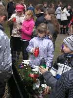 Uczniowie składają kwiaty i zapalają znicze przy symbolicznym kamieniu upamiętniającym wizytę Karola Wojtyły w Okleśnej. Spotkaniu na Szlaku Papieskim zawsze towarzyszy modlitwa oraz ulubiona pieśń Papieża „Barka”.